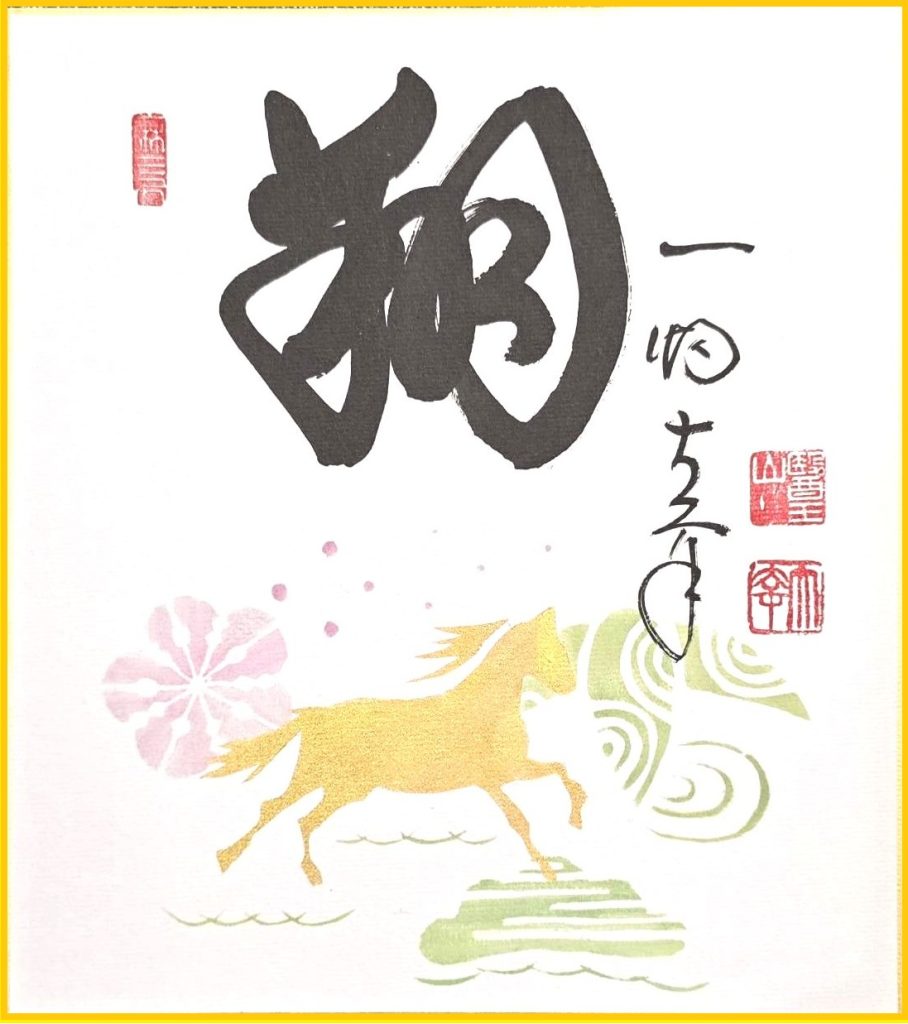 今年の色紙には「翔」と賛をつけました。(画:月真) 馬が天空を「翔ける」が如きです。羽を広げ、高く舞い、自在に生きるイメージです。しがらみから解放されて、自分の殻を破る。日々あらたなり。マンネリを打ち砕いて、おおらかに生きてほしいという願いを込めました。そういう心で、日々を過ごしていただきたいです。